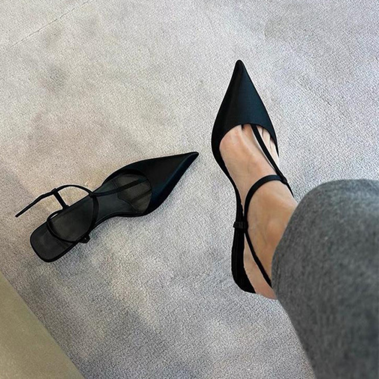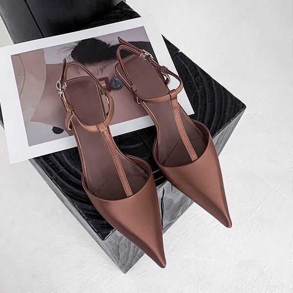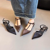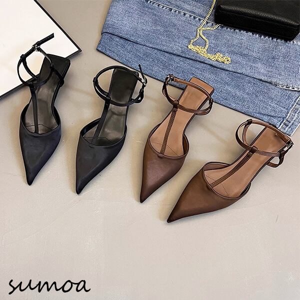 Tストラップ ミュール トング サンダル アンクルストラップ 細ストラップ ストラップ レディース ローヒール ポインテッドトゥ 美脚 サテン 歩きやすい 痛くない 走れる T字
