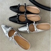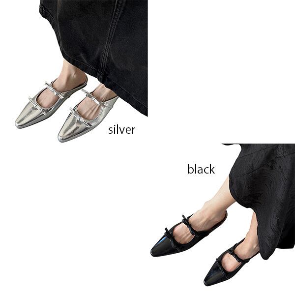 リボンミュール フラットシューズ ストラップ ミュール パンプス サンダル バレエ シューズ レディース ポインテッドトゥ 歩きやすい Wリボン ペタンコ 美脚 上品 春 安定 カジュアル