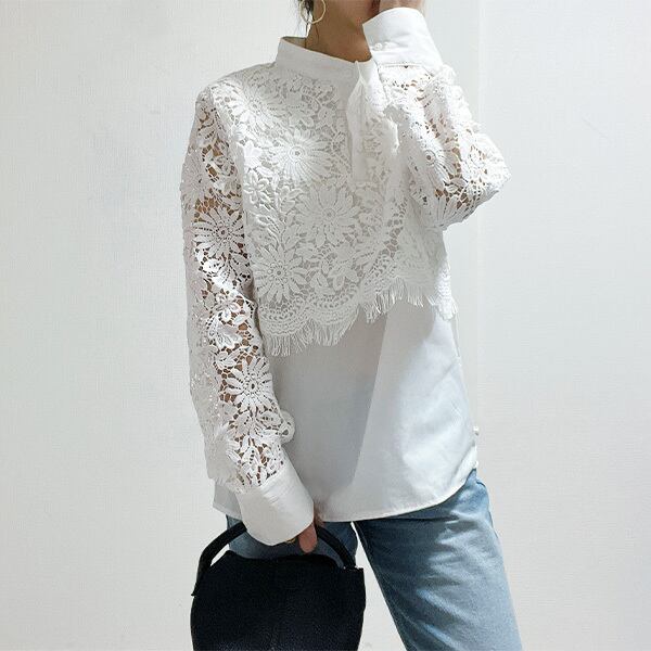 【即納あり】バンドカラーレースブラウス 刺繍 ブラウス 花柄 レース コットン エンブロイダリー フリンジ プルオーバー レディース 長袖 シャツ シアー 透け チュニック