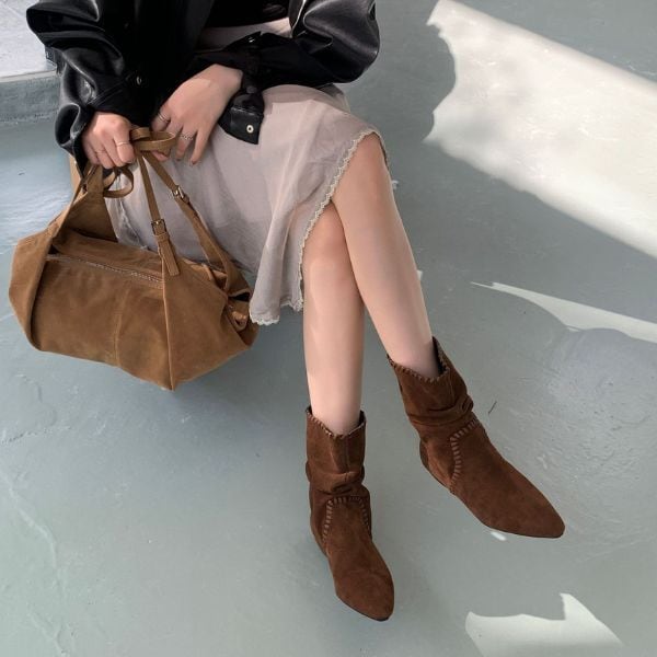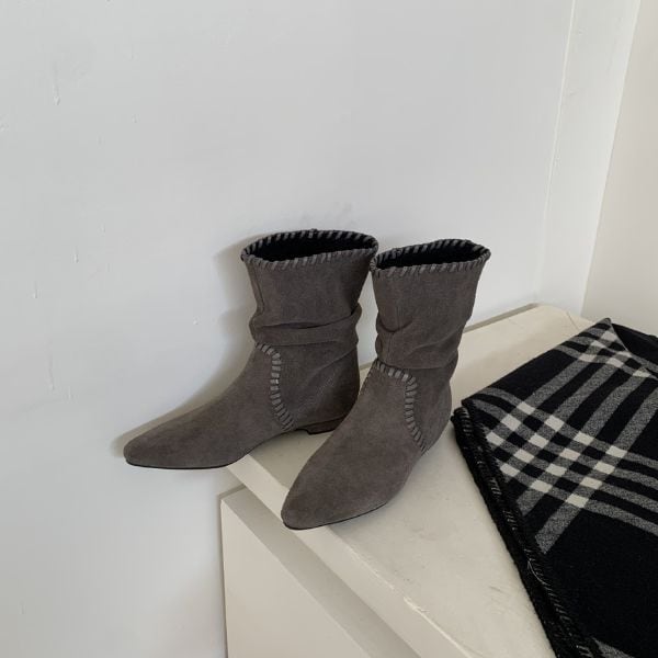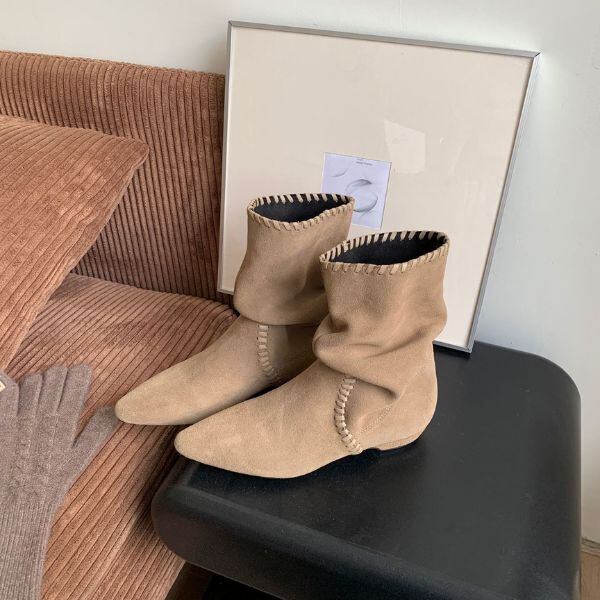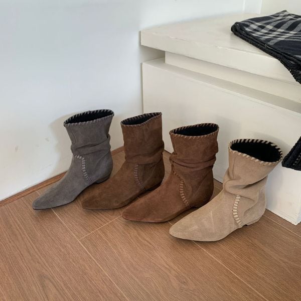 ステッチアンクルショートブーツ ステッチ ショートブーツ ヒール くしゅくしゅ ポインテッドトゥ レディース ミドル丈 スエード 歩きやすい 秋冬 痛くない アンクル丈 本革