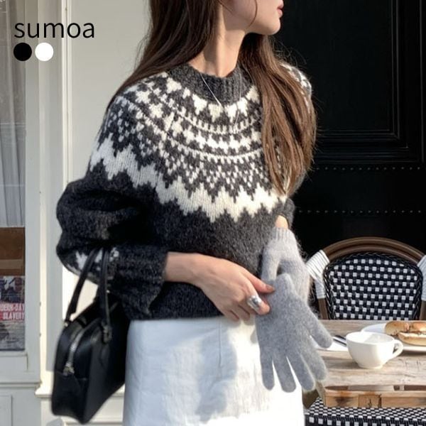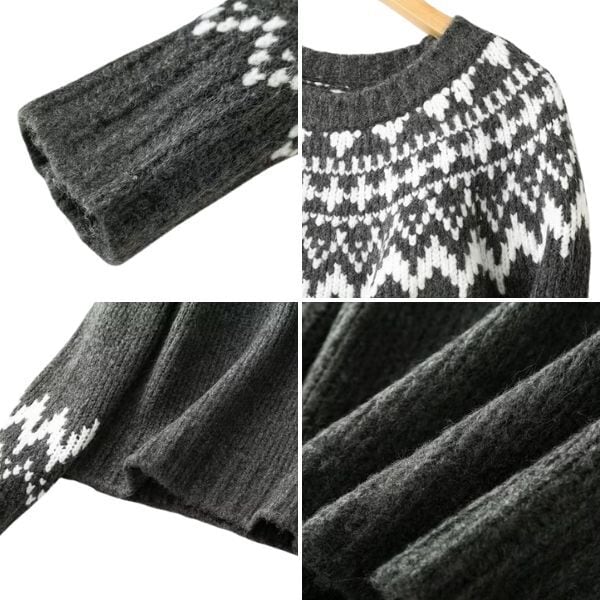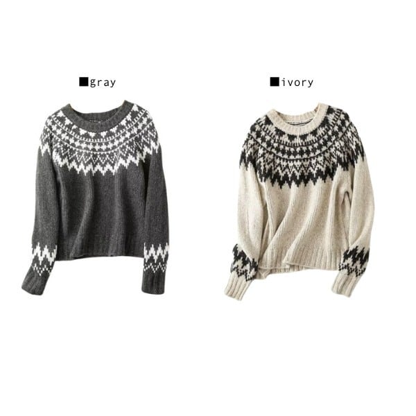 ノルディック柄ニット 求心柄 レトロ アーガイル フェアアイル柄 ニット ノルディック バルキー ニット セーター 長袖 ラウンドネック クルーネック プルオーバー ざっくり 体型カバー