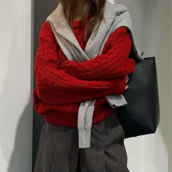 ケーブル編みニット ざっくり オーバーサイズ ケーブル編み アラン編み バルキー 厚手 ラウンドネック セーター レディース 長袖 プルオーバー ローゲージ ショート ダイヤ トップス ニットソー 体型カバー