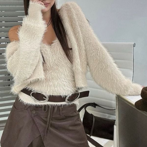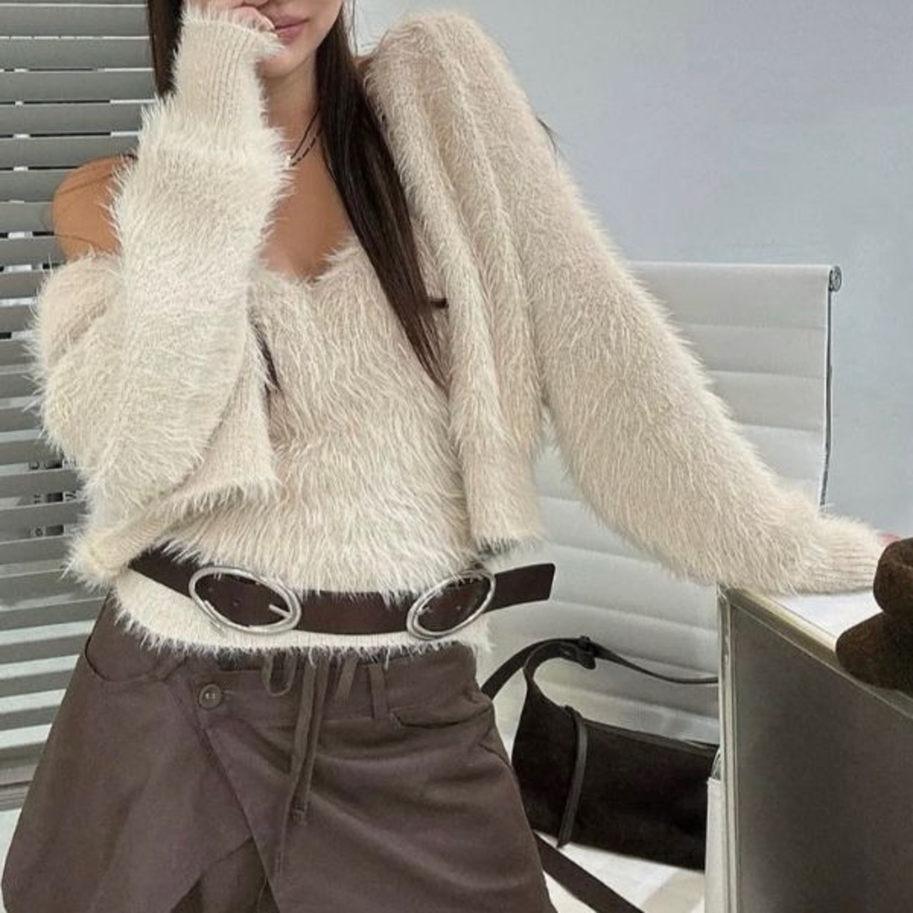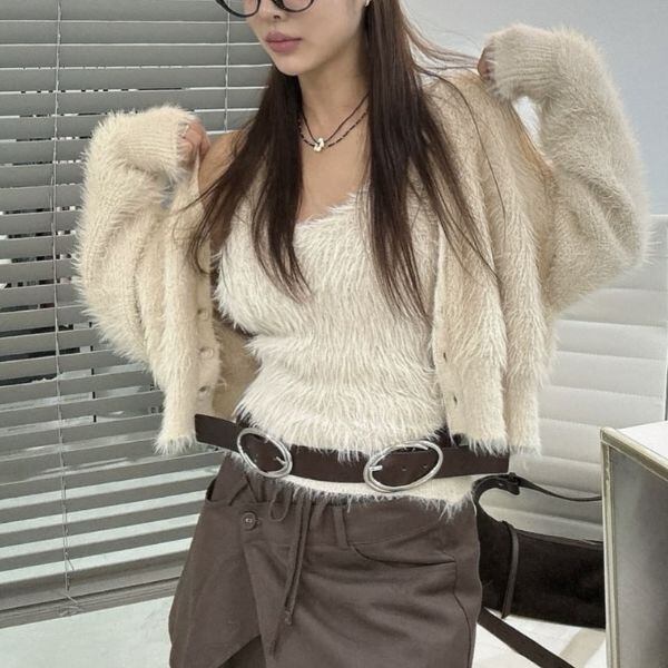 シャギーニット ビスチェ ボレロ カーディガン クロップド ニット ビスチェ キャミ付き セーター フェザー キャミソール 長袖 ドッキング セット フェミニン トップス レディース レイヤード ニットソー 韓国