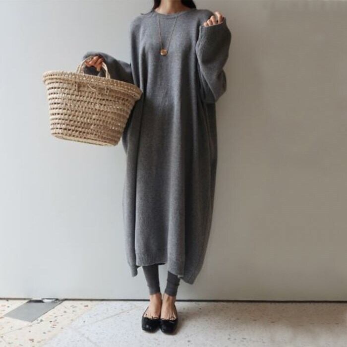 \早割・期間限定/ニットワンピース ドルマン ニットワンピ マキシ丈 ロング丈 ラウンドネック クルーネック 無地 バルーン レディース ニット マキシ丈ワンピ ロングワンピ 体型カバー 秋冬 春夏 レイヤード ワンピース ルーズ 大きめ korya90