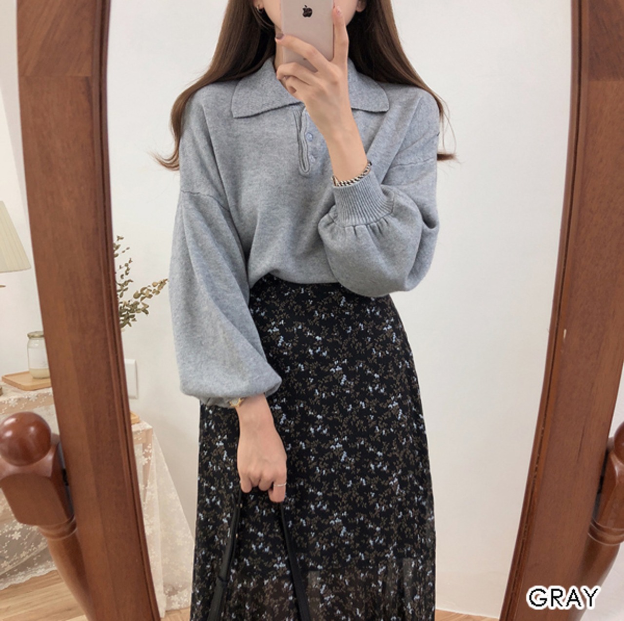 ニット ポロ ポロニット 襟付きニット 無地 シンプル ぽわん袖 袖ボリューム バルーンスリーブ ニットソー セーター レディース 長袖 プルオーバー 秋冬 春夏 カットソー bws008