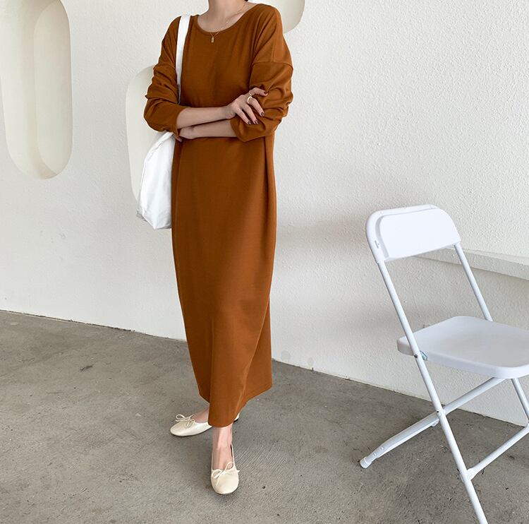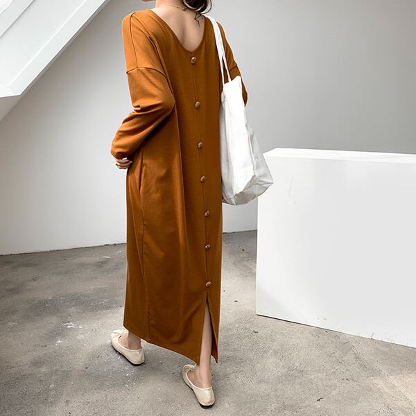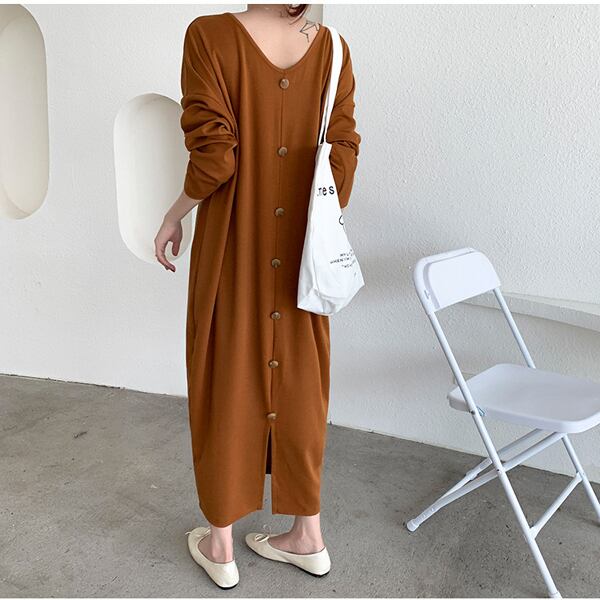 ワンピース バックボタン マキシワンピース フリース 2way コクーン センターボタン レディース マキシ丈 ロング丈 ロングワンピ 無地 長袖 体型カバー スリット Vネック kags003