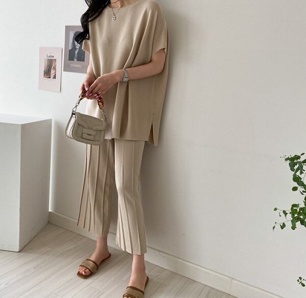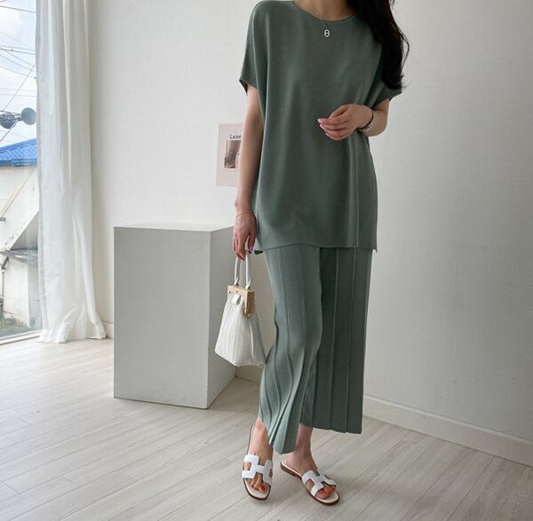 セットアップ フレンチスリーブ ニットアップ サマーニット プルオーバー ワイドパンツ ワンピース Tシャツ アンサンブル 無地 2点セット ニットパンツ 半袖 パンツセット 冷感 ひんやり 涼感 春夏 カジュアル イージーパンツ ワンマイル 上下 七分丈