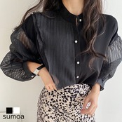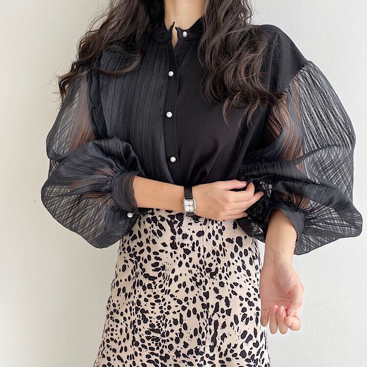 ブラウス バンドカラー シャツ シアーシャツ サテン ぽわん袖 袖 ぽわん バルーン袖 バルーンスリーブ ノーカラー パールボタン スタンドカラー ボリューム袖 無地 長袖 レディース コンシャス レディース オフィス 春夏 秋冬