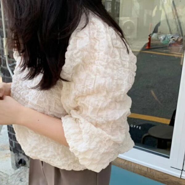 【即納あり】ポップコーンブラウス ぽこぽこ ワッシャー ジャガード プルオーバー カットソー パフスリーブ ボリューム袖 ぽわん袖 袖ぽわん ラウンドネック ドロップショルダー ゆったり レディース 秋冬 春夏 体型カバー 無地 ジャガード オルチャン ガーリー フェミニン