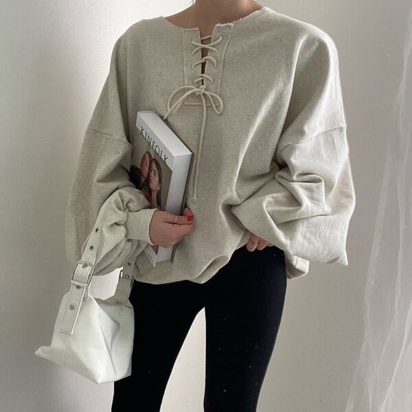 レースアップカットソー トレーナー レースアップ スウェット クロス 編み上げ プルオーバー ボリューム袖 バルーンスリーブ ぽわん袖 カットソー Tシャツ レイヤード 重ね着 ロンT 長袖 レディース 秋冬 春夏 体型カバー フロントレースアップ