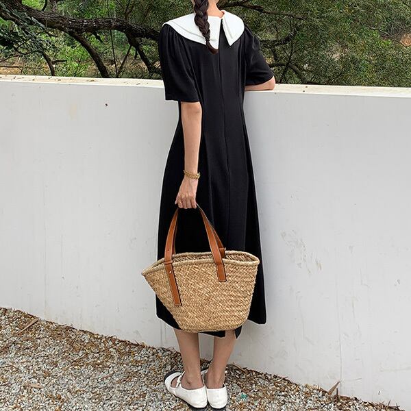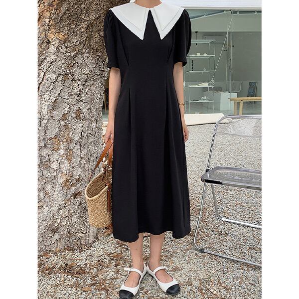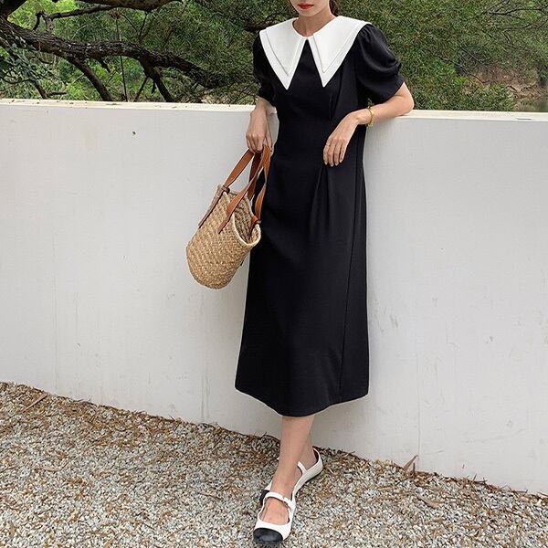 【即納】ワンピース ビッグカラー セーラーカラー 2way 襟付き コクーン パフスリーブ きれいめ モノトーン おしゃれ タイト ペンシル エレガント ガーリー セレモニー OL 2次会 パーティ 入学 入園 お呼ばれ バイカラー