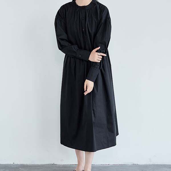 シャツワンピース ギャザーワンピース ロングワンピース ギャザー ノーカラー Aライン レディース フレア ワンピース ロング丈 春夏 体型カバー レイヤード 重ね着 長袖