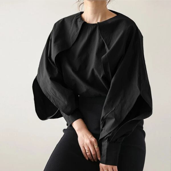 ケープブラウス ノーカラーブラウス ケープ トップス トップス ブラウス バルーンスリーブ ぽわん袖 プルオーバー レディース カットソー 春夏 長袖 ボリューム袖 無地 韓国