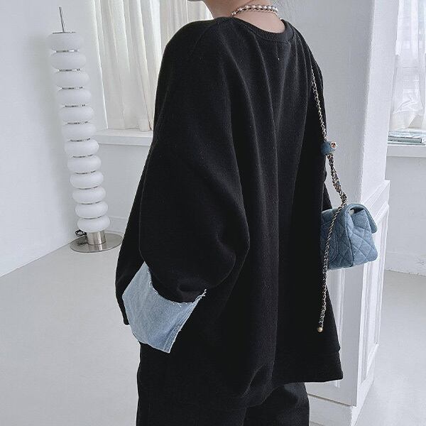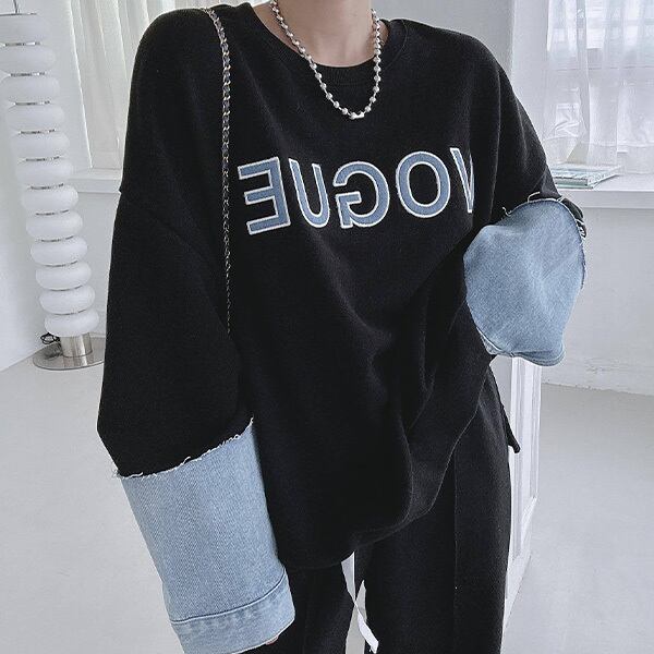 【sumoaスモア】スエット トレーナー ロゴ デニム ラウンドネック レイヤード レディース プルオーバー 重ね着 パッチワーク 長袖 体型カバー カジュアル 英字 オーバーサイズ カットソー