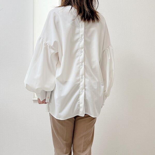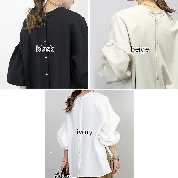 前後2way ブラウス バンドカラー スリット ボリューム袖 シャツ ぽわん袖 ぽわん バルーン袖 無地 長袖 二の腕カバー レディース コンシャス オフィス OL セレモニー 入学 卒業