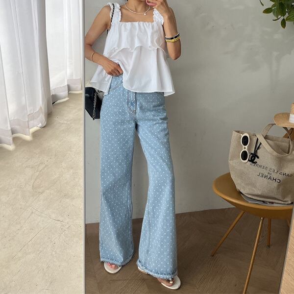 ワイドデニムパンツ ドットデニムパンツ ワイド カットオフ ストレート ジーンズ ジーパン 水玉 レディース ボトムス ウォッシュ ブリーチ フリンジ