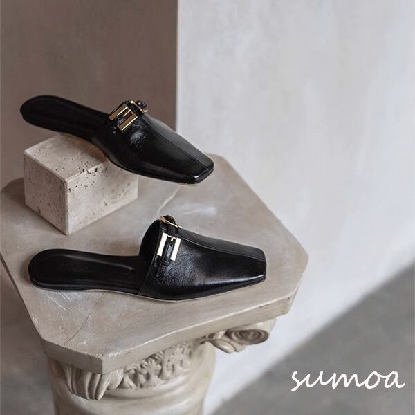 ビット ミュール ワンマイル パンプス シューズ 靴 ローファー おじ靴 マニッシュ 踵なし 安定 歩きやすい ローヒール レザー 金具 モチーフ ミュールパンプス スクエアトゥ