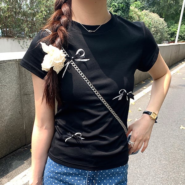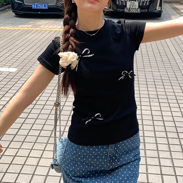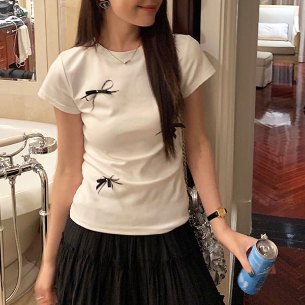 リボンモチーフTシャツ リボン Tシャツ 半袖 ラウンドネック プルオーバー カットソー カレッジ カジュアル トップス レディース 春夏 無地 ゆったり 着回し