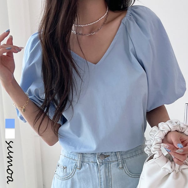 ブラウス パフスリーブ ぽわん袖 コットン Tシャツ ボリュームスリーブ ランタンスリーブ Vネック 半袖 シャツ ブラウス レディース カットソー バルーンスリーブ 袖ボリューム トップス 無地 韓国
