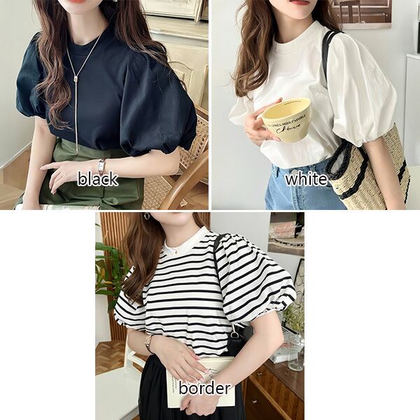 リボンカットソー パフスリーブ バックシャン ぽわん袖 コットン Tシャツ ボリュームスリーブ ランタンスリーブ モックネック 半袖 ブラウス ボーダー カットソー バルーンスリーブ 袖ボリューム 無地 韓国