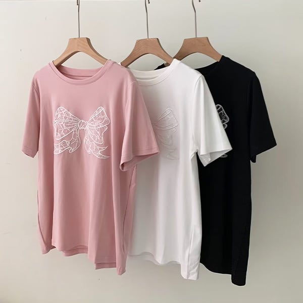 リボンTシャツ リボン 刺繍 Tシャツ りぼん リボン プルオーバー プリント カレッジ カジュアル ゆったり 半袖 トップス レディース 春夏 ゆったり 着回し 韓国