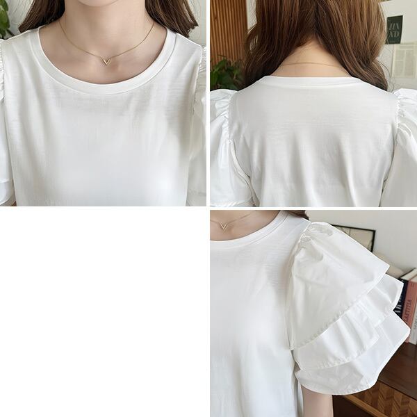 【即納あり】フリルショルダーTシャツ 袖フリル ティアード パフ袖 Tシャツ カットソー 半袖 プルオーバー ドレープ トップス レディース 無地 切り替え 韓国ファッション パフスリーブ