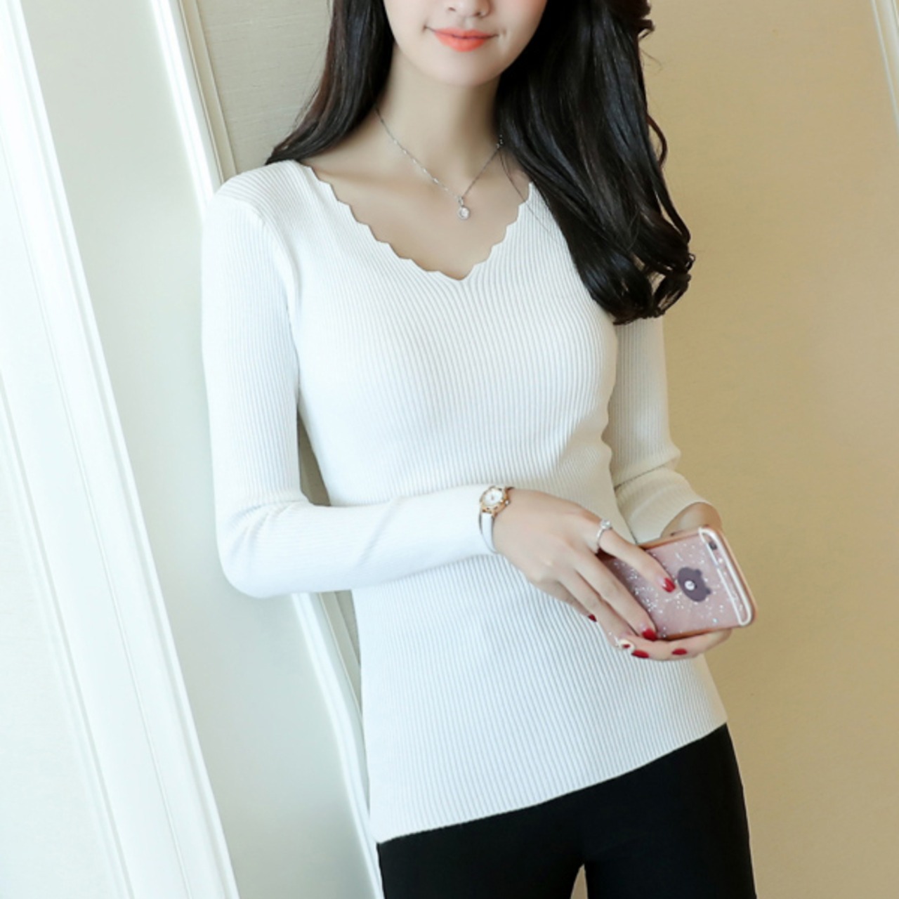 Vネックリブニット スカラップ リブニット ニットソー トップス Vネック レディース セーター