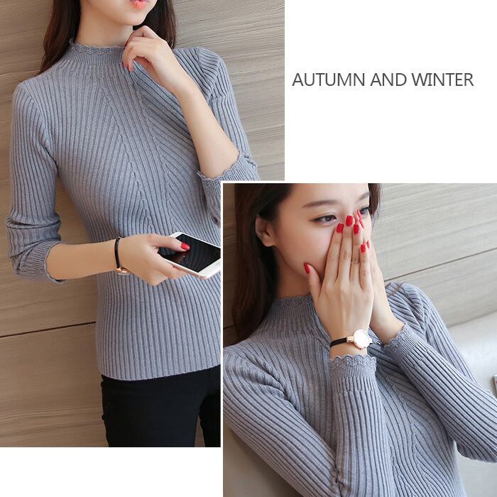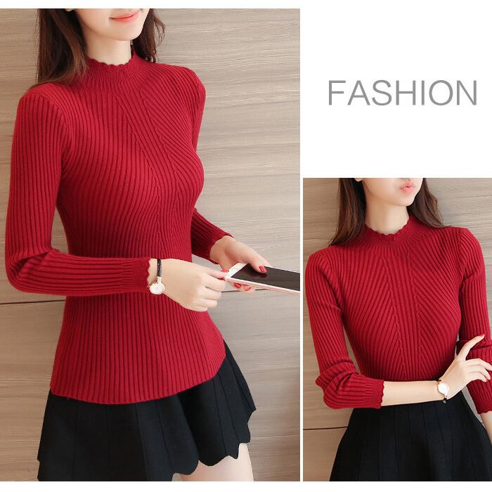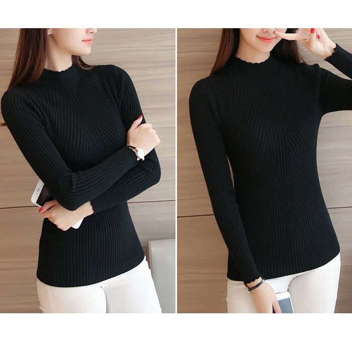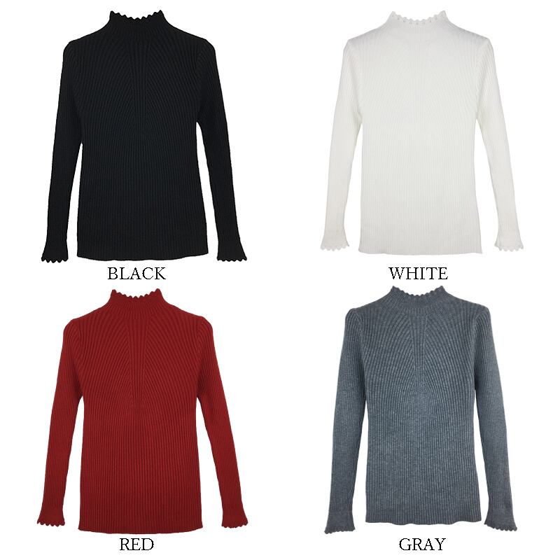 ボトルネックリブニット ハイネック スカラップ セーター トップス スリムニット レディース