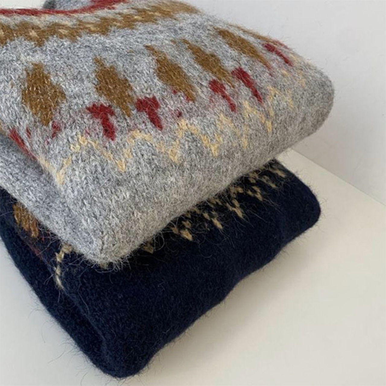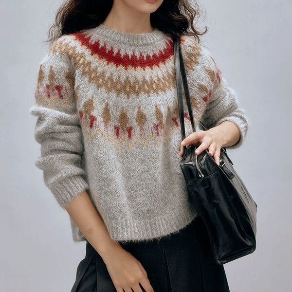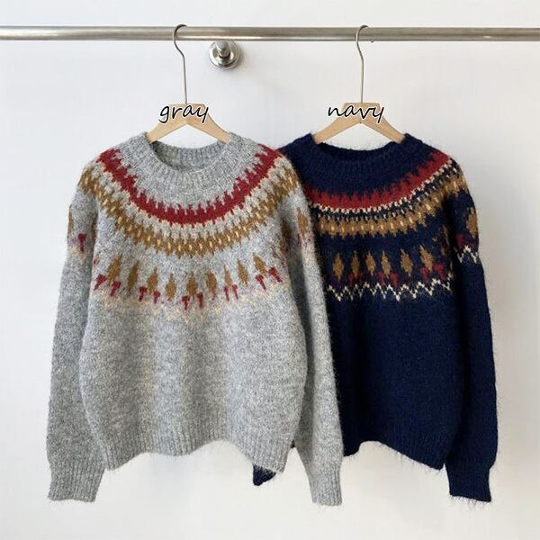 ノルディック 求心柄 レトロ アーガイル フェアアイル柄 ニット ノルディック バルキー ニット セーター ラウンドネック クルーネック プルオーバー ざっくり 体型カバー モヘヤ